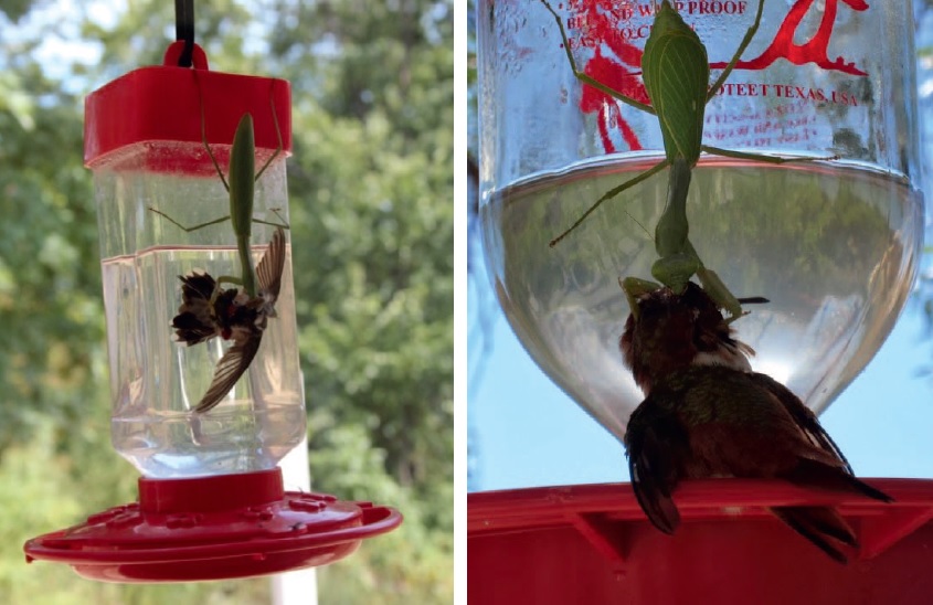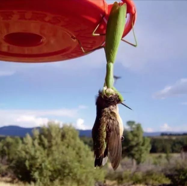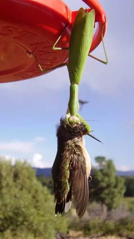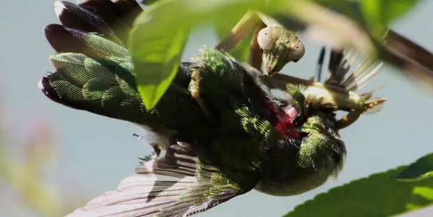 一只螳螂在吃一个不幸的红宝石喉蜂鸟,图片来自:http://gizmodo.com