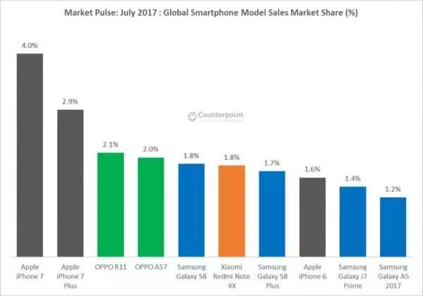 举个例子,诸如OPPO上半年推出的R11,我们看到自其上市之后,就开启了销量霸榜模式,连续在多家调研机构的统计榜单中夺得了市场销量第一的位置。诸如在Counterpoint公布的7月全球畅销智能手机前十排行榜中,OPPO R11就以2.1%的销量占比挤下了三星S8,成为了全球最为畅销的安卓智能手机。