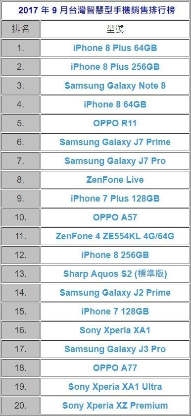 9月台湾智能手机销量TOP20图片来自eprice