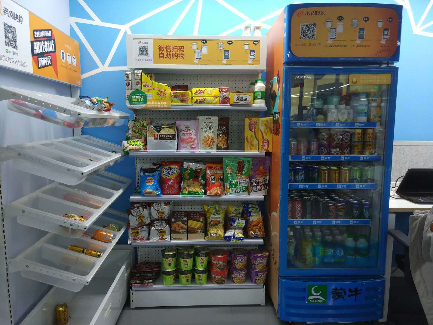 可以看到,各家无人货架企业所使用都是很简易的物料,成本不高。至于冰箱,上述小e微店的市场人员告诉懂懂笔记,企业多是与冷饮、乳品公司合作,由对方提供冰箱,小e微店就是与蒙牛达成了战略合作,拿到所有的免费冰箱。