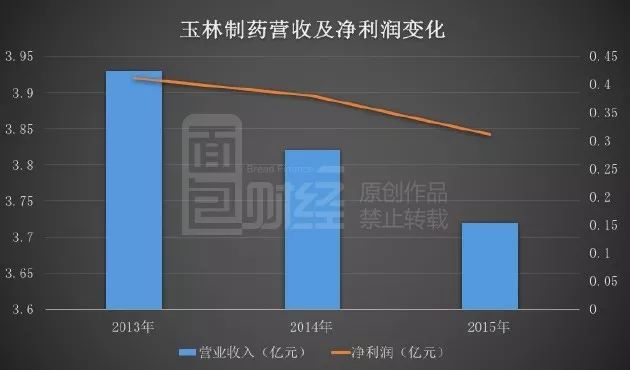 2013年以后,玉林制药营业收入持续下滑,2013-2015年,其营业收入复合年均下滑2.71%。受到营收持续下滑的压力,2015年其除税后净利润下滑19%至3060万元。
