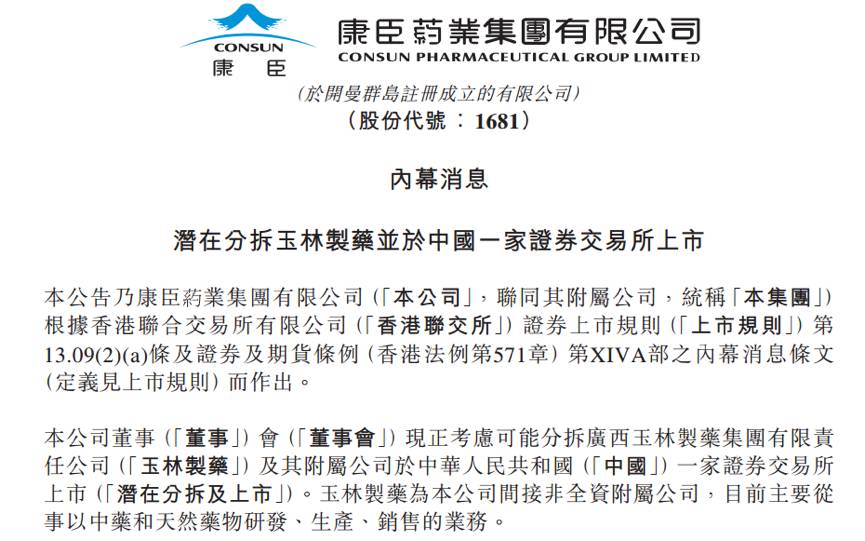 10月19日,康臣药业发布公告,公司现正考虑可能分拆广西玉林制药集团有限公司及其附属公司于中国一家证券交易所上市。