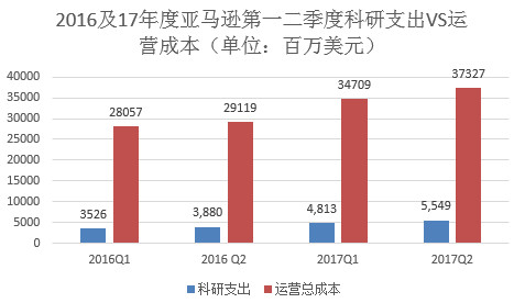 在亚马逊官网上公布的2017第二季度财报中,科技和内容方面的支出也呈现不断攀升势头。财报显示,亚马逊Q2营收营收总成本234.51亿美元,其中研发费用55.49亿美元,占据了营收总成本的23.7%,相当于亚马逊2016年全年净利润的70%。足以见得,亚马逊非常重视在研发上的投入,这些年,亚马逊已经逐渐从电商平台蜕变成一个平台+技术的综合性科技公司。