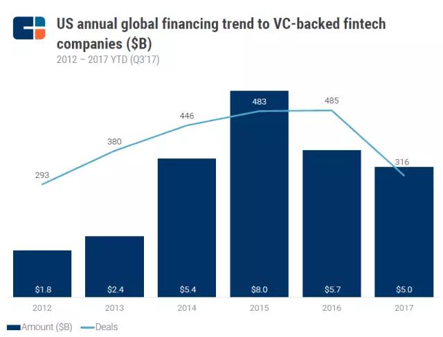 今年第三季度,美国金融科技领域的风险投资交易数量增长了11%。总融资金额达到19亿美元,共有10笔5000万美元以上的融资事件。如果按照当前的速度,2017年美国金融领域风险投资的交易将会下降到低于2014年的水平,但由于后期阶段的企业增多,单比融资金额增高,今年的总融资金额将会超过2016年的57亿美元。