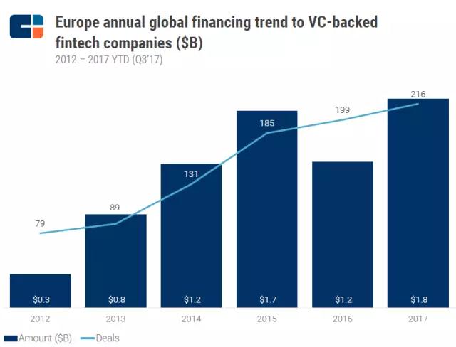 今年第三季度,欧洲金融科技领域的风险投资数量达到65笔,总融资金额达到5.38亿美元。2017年至今,欧洲金融领域的投资数量已达216笔,总融资金额达到18亿美元。如果按照现有的速度,2017年欧洲金融科技领域的总融资金额将超过20亿美元。