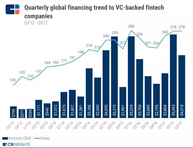 2017年第三季度,全球金融科技领域共发生278笔交易,总投资金额达40亿美元。交易数量与第二季度持平,总投资金额则下降了25%。虽然如此,按照这个速度,2017年全年的交易数量和投资总金额都将创历史新高。