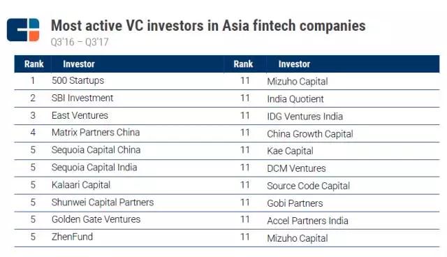 500 Startups是该领域亚洲最活跃的投资机构,是近5个季度投资最多的风投机构。SBI Invesment、East Ventures和经纬中国紧随其后。从企业投资来看,第三季度的交易数量占整体的1/4,也是近5个季度的最低占比。