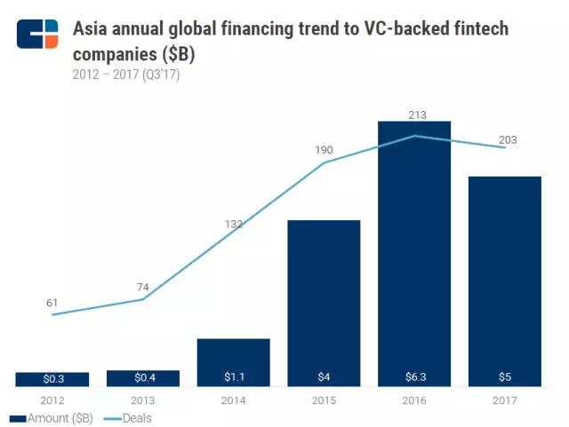 今年第三季度亚洲金融科技领域的交易数量基本与第二季度相当,有77笔,但总融资金额则下降了近50%,只有14亿美元。虽然如此,2017年至今的总交易数量已达203笔,只比2016年全年少了10笔。按照这个速度,2017年交易数量将比2016年增长29%,总融资金额预计也将超过2016年的63亿美元。
