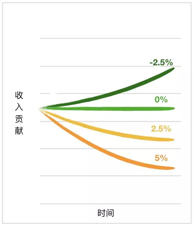黄色线:完全没有开展客户成功,也没有任何扩展销售的收入,流失率很高,收入贡献逐年急速下降