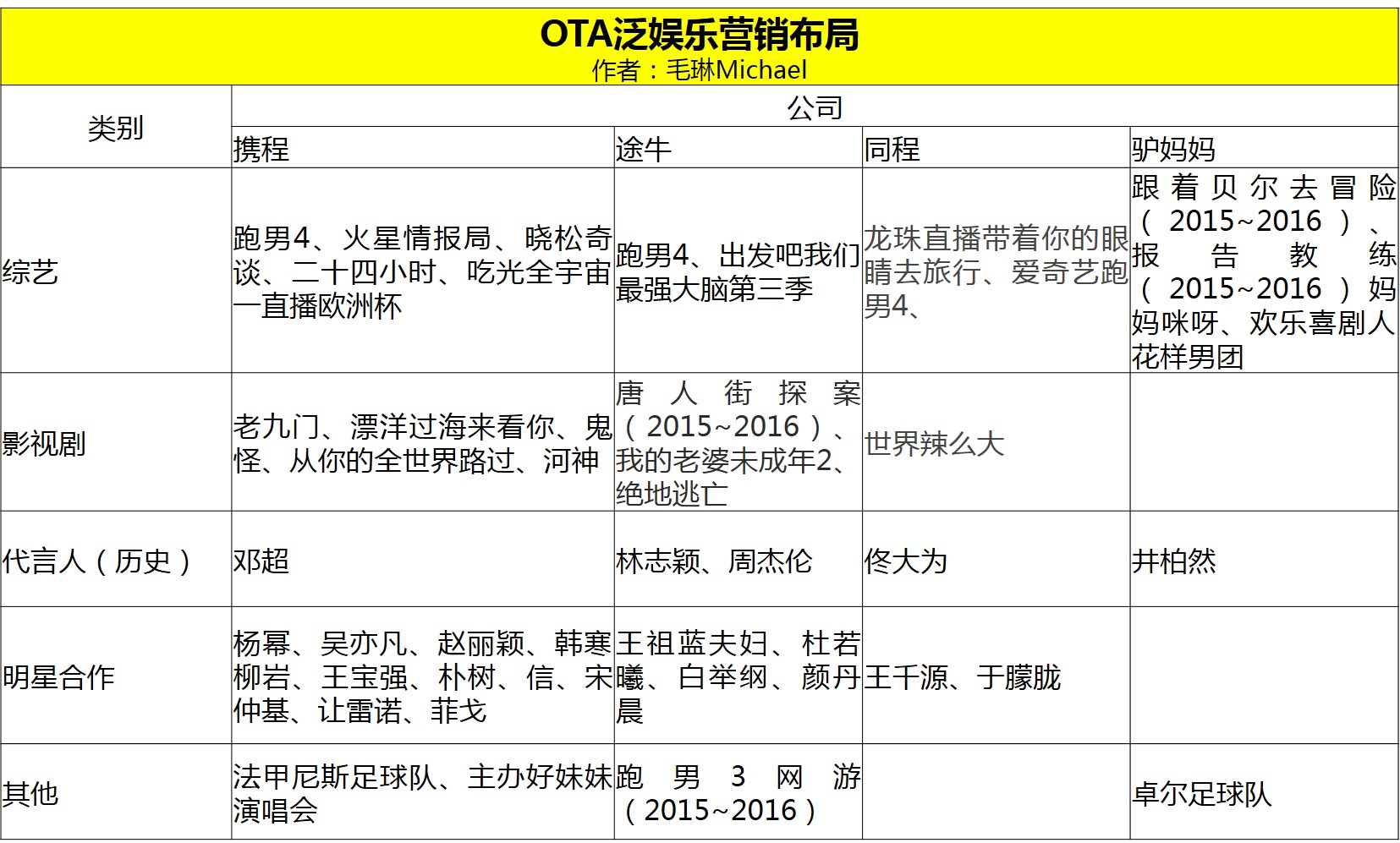 OTA是一个重运营的低毛利行业,在很长的一段时间内营销相对更注重产出,而不是品牌传播或者产品定位,行业营销处于比较稳健的状态。但这在2016年后有了不一样的变化,最大的变化就是对泛娱乐营销的重视,可以说泛娱乐营销让OTA营销从产品特价型的促销到存在感的差异化营销。