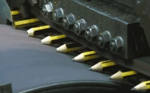 竖直方向上根根排列好的铅笔,最底部的一根总是会被推送到染料机里。