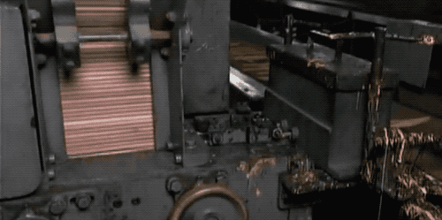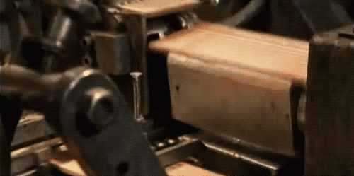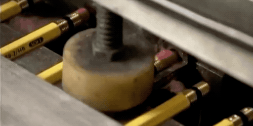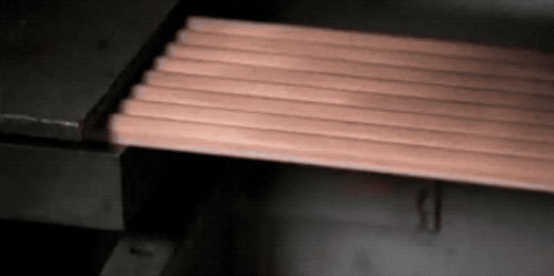 翻转机再把另一块开了沟槽的板子盖上去,就做成了一个铅笔三明治。这就是笔芯放进铅笔的方法,完全不是我们脑补的:在木头上打洞再塞笔芯。