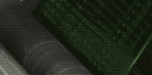 笔芯按照 8 根一组在旋转的滚轮传输带上被准确的装入沟槽里,像是齿轮的啮合一样精确。先前注入的胶水这时候能固定住笔芯。