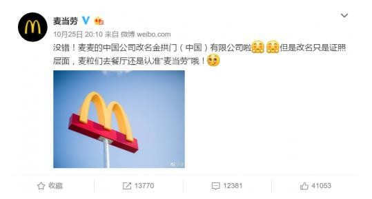 对于名字这方面,麦当劳官微回应,麦麦的中国公司改名金拱门(中国)有限公司啦,但是改名只是证照层面,麦粒们去餐厅还是认准“麦当劳”哦!