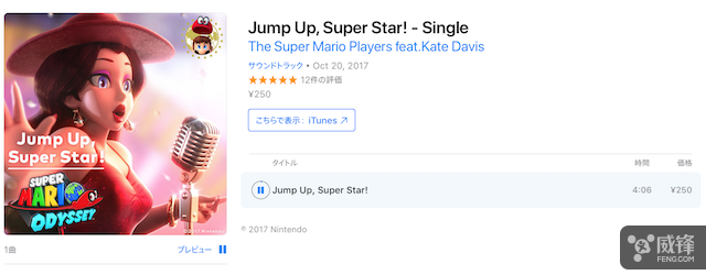 除了表情包贴纸外,苹果 iTunes 前不久也上架了《超级马里奥 奥德赛》的主题曲 Jump Up, Super Star! 同样可以切换到上述几个区试听或者购买,价格大约为 8 港元。任天堂官方已将 Jump Up, Super Star! 的试听版开放限时免费下载,现在>> 前往官网 <<就能够免费下载到这首歌,到 2018 年 1 月中旬为止。不过想要获得完整版全曲的话,还是得到 iTunes 购买。