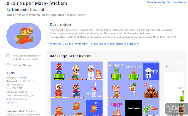 去年年底《超级马里奥跑酷》在 iOS 首发上架后,任天堂随即配合 iOS 10 的新 iMessage 推出了一款《超级马里奥跑酷》的表情包,很受欢迎。今天,为配合 NS 版《超级马里奥 奥德赛》全球发售,任天堂又上架一款表情包贴纸,不过这次走的是 FC 时代的 8-bit 复古马里奥风格,而且也要钱了。