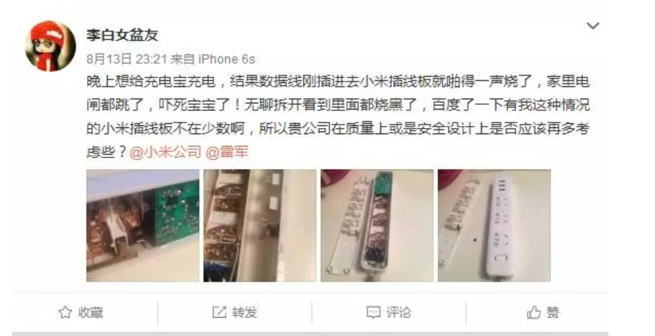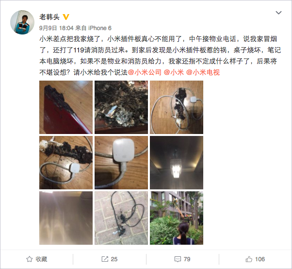 在今年9月9日,微博用户“老韩头”发表了微博,称因为小米插件板的问题,桌子、笔记本等物品均被烧坏,希望小米能改一个说法。
