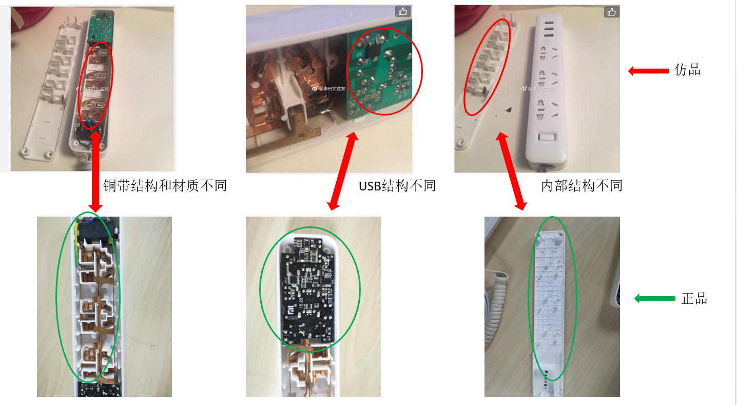 4.用户文章中所引用的所谓小米产品安全问题的案例严重失实。例如,引用下述的微博截图,用户所使用的插线板铜带结构、材质、USB结构和插线板内部结构均与正品小米插线板有显著差异,为假冒小米商标的伪劣产品。