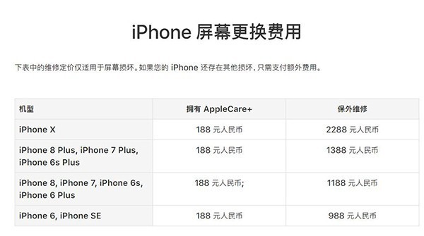 不过通过苹果官网的信息可知,如果用户拥有AppleCare+,那么其iPhoneX的换屏价格则只需支付188元,如果没有的话,才会以2288元的价格来换屏。不过相比于iPhone8Plus的换屏价格1388元来看,两款手机本身的价格相差近两千元的价格,这样的价格也多少说得通了。不过从其换屏价格表中可以看出,拥有AppleCare+的换屏价格可以说相对划算一些。