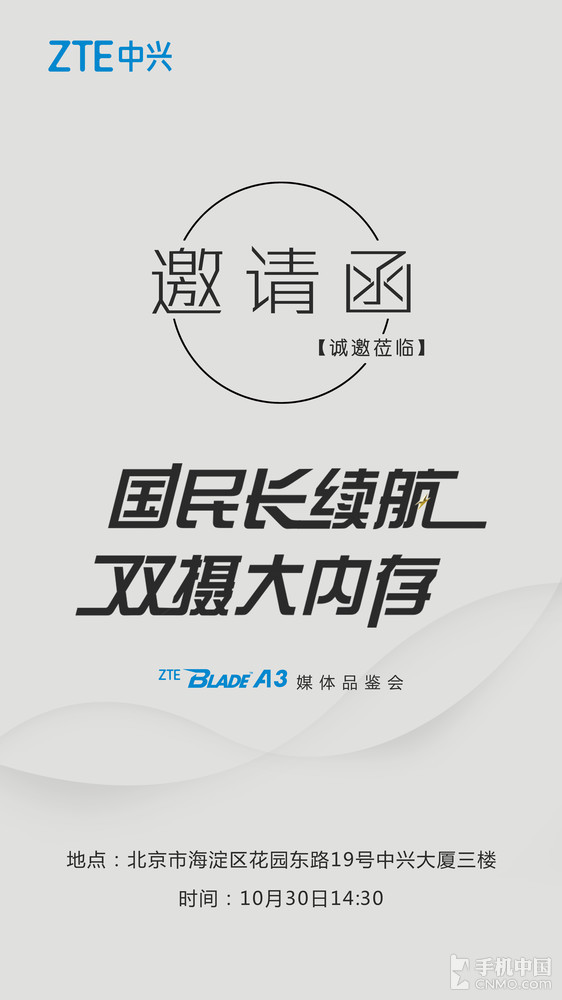 【手机中国 新闻】就在10月中旬,中兴在美国纽约发布了折叠双屏手机中兴天机Axon M。这款产品一经问世便引起极大反响,毕竟这可是千机一面时代中为数不多的变革者。不过该机离国内上市或许还有一两个月的时间,而今天下午,中兴另一款千元神器中兴Blade A3将在北京正式亮相,长续航、双摄和大内存成为其最大卖点。
