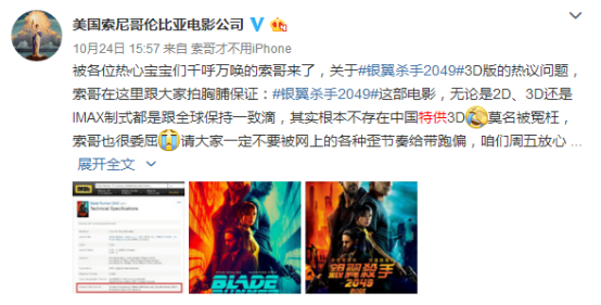 针对网友争议的“中国特供3D”的问题,该片的出品方美国索尼哥伦比亚电影公司迅速在微博做出了回应——“这部电影无论是2D、3D还是IMAX制式都是跟全球保持一致的,根本不存在中国特供3D”。