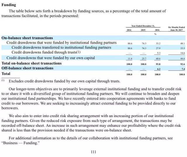 招股书的另一个数据显示,截止到2016年底及2017年6月30日,趣店转让给P2P平台的信贷额度分别为人民币80.99亿元(11.97亿美元)和2.751亿元人民币(约合4060万美元),分别在当期机构资金交易总额占比达到63.7%和1.3%。而到了2017年4月,趣店已经停止向P2P平台转移信贷额度。