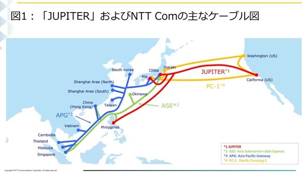 据了解,Jupiter光缆在日本有两个登陆点,分别位于三重县和千叶县(再通往东京和大阪),在美国直达洛杉矶,并能通过ASE光缆从日本千叶县和菲律宾转道前往香港。此外,新光缆与NTT Com现有的ASE、APG、PC-1相结合,可大大提升日本互联网对外互连速度,并提高整体可靠性。特别的是,Jupiter光缆将采用WSS ROADM(波长选择开关-可重构光上下路多路复用)技术,可从容应对自然灾害带来的破坏。