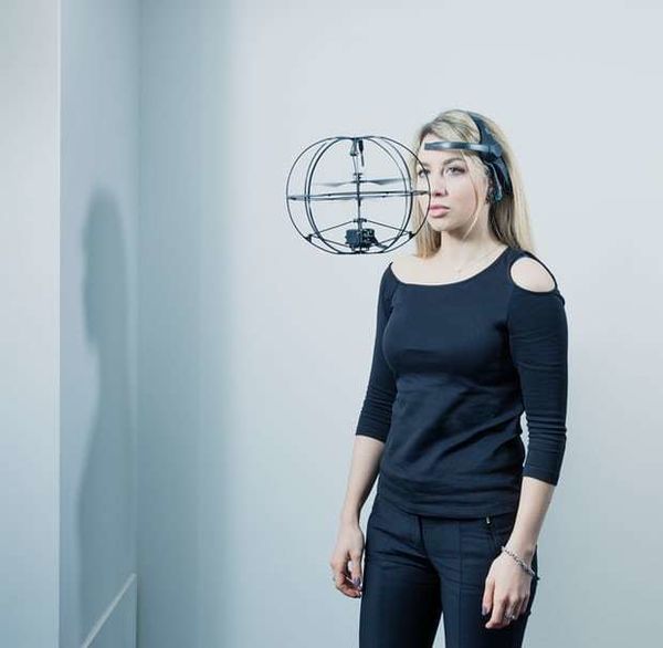 辛克莱是一名计算机科学、语言学以及视觉文化的研究人员,她主办过许多活动来探索跨物种生物的进步。在下面的图片中,她展示了脑电波技术,该技术通过头戴设备将注意力集中在大脑中,从而控制外部物体。在这种情况下,控制地面上的无人机起飞。