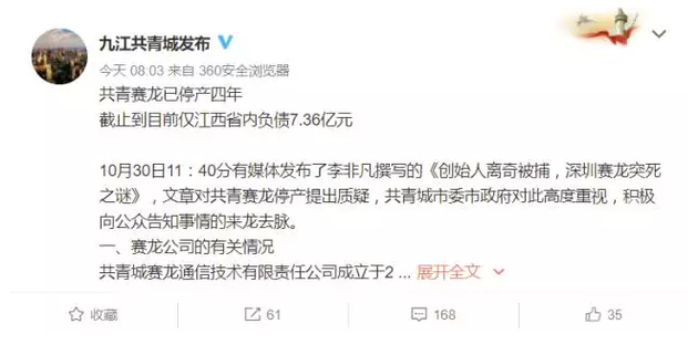 九江共青城发布表示,共青赛龙公司出现上述问题之后,江西省,九江市,共青城市三级政府积极帮扶共青赛龙公司。