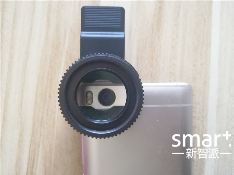 小编按照使用说明书的操作步骤将广角镜头夹在手机后置镜头上,夹子比较有力且有护垫保护,戴的时候十分牢固。不过,一只手拿着手机拍照有点费力,大概是镜头外壳材质所造成的。