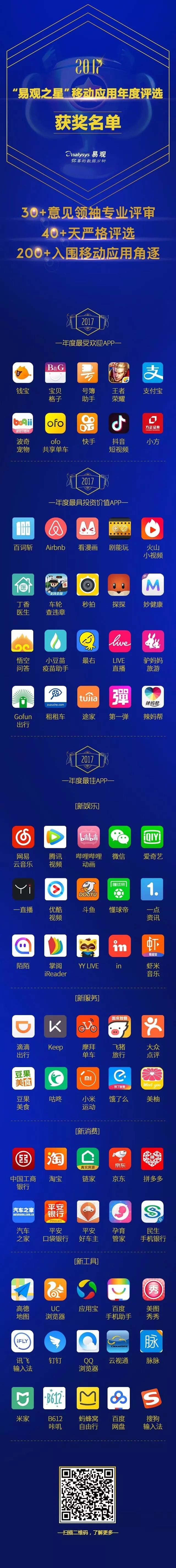 2017“易观之星”评选是基于易观千帆大数据系统,依托易观独家研发的实力矩阵模型,通过企业复合增长率、用户规模及实力矩阵并结合多位意见领袖的评定结果,最终筛选出获奖应用。而“年度最受欢迎APP”则由大众投票产生,可查看实时数据,保证评选过程的透明公正。