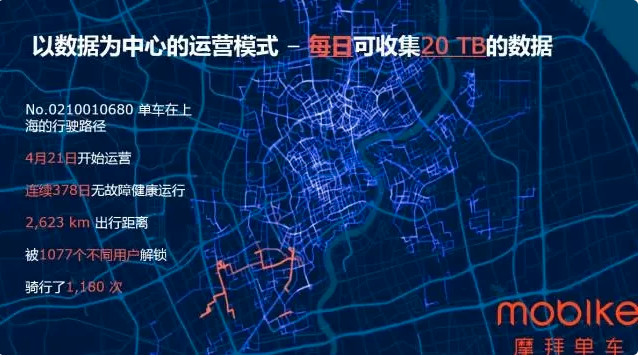 摩拜的一台编号为No.0210010680的单车,从去年4月21日开始投入使用,一年后被骑行了1180次,出行距离2623km,每两秒钟上传一次信息。所有摩拜单车每天上传的信息量超过20TB。