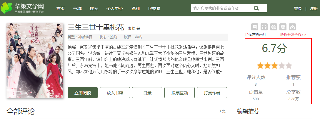 氢媒工场在华策文学网(华策自称该站为“超级IP孵化平台”)中发现,其各类文学读物点击量并不理想,电视剧曾红极一时的《三生三世十里桃花》点击量仅590,评分6.7(满分10分,仅3人进行了评分)。