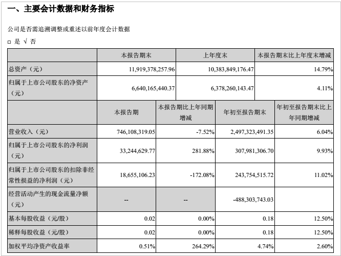 报告显示,公司前三季度实现营业收入24.97亿元,同比增长6.04%,实现归属于上市公司股东的净利润3.08亿元,同比增长9.93%。