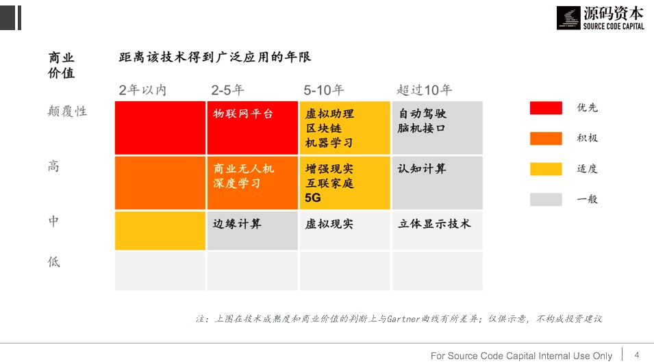 例如:一项技术的价值如果是颠覆性的,且在5年内能得到广泛应用,那我们就应当给予最高的投研优先级(对应图中深红区域);反之,如果一项技术有较高价值,但距离工程和商业上的成熟还有5年以上距离,那么我们应当谨慎布局或者以储备认知为主(对应黄色和灰色区域)。