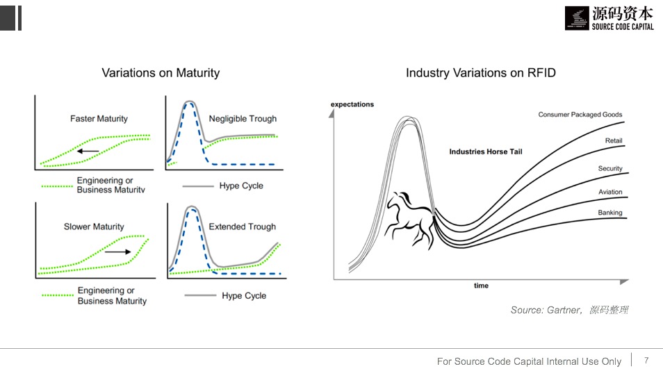 另一类变体是“马尾效应”,指一项技术在工程上趋于成熟,但在不同行业中的发展命运却呈现明显差异。上图右侧给出的例子是RFID。这项技术在90年代中期曾被各行各业寄予厚望,但最终得到广泛应用的领域主要是快消和零售,在航空业货物分拣上的尝试很早就以失败告终。