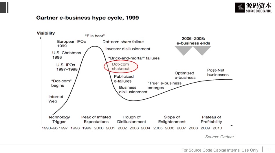 这个观点在当时太过离经叛道,以至于Gartner内部也引起了不小争论。历经数月说服,评审委员会才下定决心将研报下发给数千名客户。这一天是1999年11月9日。四个月后,美国股市真如Alex预言的那样开始崩盘,NASDAQ指数在上探到历史新高5132.52点后急转直下,到2001年几近腰斩。Gartner光环曲线(Gartner Hype Cycle)也因此在业内一战成名。