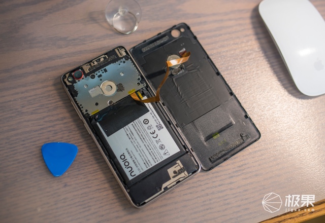 努比亚把Z11 mini的WiFi/GPS/MIMO天线都打印在了保护壳的注塑部分,这样使得Z11 mini的后壳可以做得更薄、更柔软,当手机摔地时起到一定的缓冲作用,后盖只有一个指纹识别有排线连着。