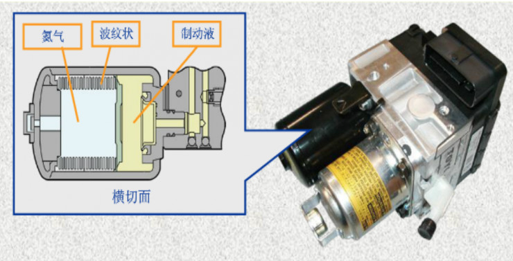 上图为丰田EBC的高压蓄能器,有点类似一个气压弹簧。高压蓄能器制造工艺是个难点,博世最初是用储能球,实践证明,氮气的高压蓄能器才是最合适的。