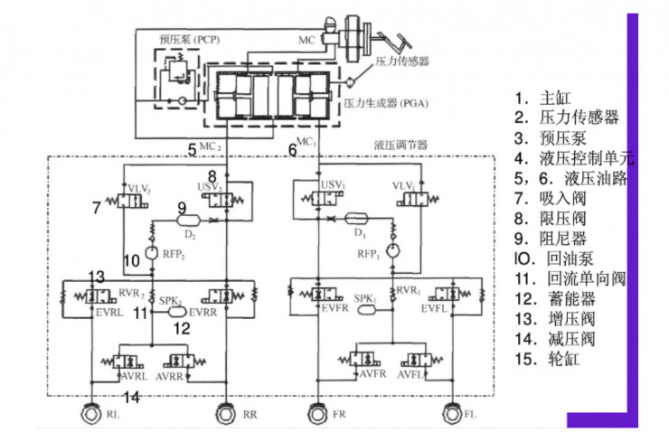 ESP与ABS非常接近,与ABS最大的不同在于ESP可以在没有踩刹车踏板的情况下向轮缸输出制动压力,ABS只能在踩下刹车踏板后从主缸向轮缸输出压力。压力生成器就是电机和柱塞泵, 与ABS比多了4个柱塞泵,4个电磁阀,也就是VLV和USV。