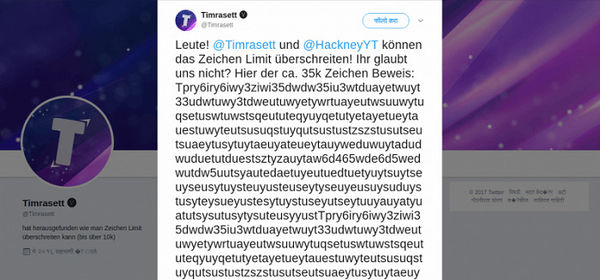 【PConline资讯】Twitter 长期以140字符的限制而被用户所诟病,但是你别指望其拓展测试的280字符推文功能可以带来好得多的体验。上周末的时候,两位德国伙计尝试着用“旁门左道”来突破 Twitter 的字符数限制,没想到还真让他们得逞了。 这个万圣节后的诡计,成功地让他们发布了一条包含35k字符的推文。虽然官方已经删除了这条推特消息,但互联网档案馆(Internet Archive)却大方地将它收录到了存档数据库中。