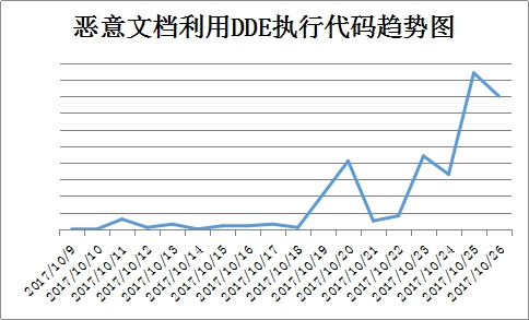 DDE文档是最近曝光的一种新的攻击手法,攻击者不需要目标开启宏即可执行任意命令,如果安全意识不够强的话很容易中招。在DDE执行代码的技术细节被公开后的前几天中,鲜有恶意文档利用这种技术,但随着时间的推移,这种利用方式出现得越来越多。