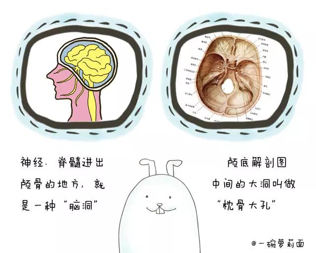 脑壳很坚硬,但它们可不是全封闭设计。大脑的神经、血管都需要与外界连通,脑壳上也为连接这些线路留好了出口。脑壳上,最大的那个脑洞叫做“枕骨大孔”,它位于颅骨的底部,脑和脊髓就在这里相连接。除此之外,脑壳上别的洞也不少,比如“颈静脉孔”、“圆孔”、“卵圆孔”等等,在这里也分别有一些血管和神经穿过。