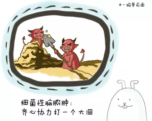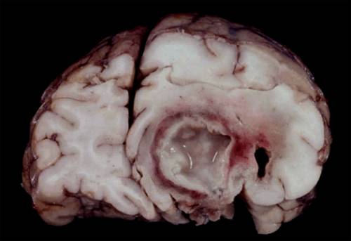 比如说,当一些细菌或真菌感染了脑实质、形成脑脓肿时,被感染的脑组织会出现坏死,接下来坏死的组织逐渐增多、融合,最终可能就会形成一个“大空洞”,里面漂浮着感染菌、坏死组织的碎片,以及炎症细胞。
