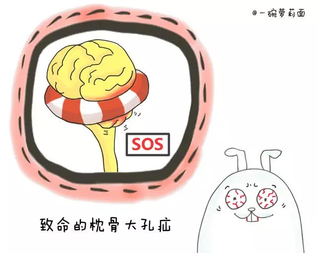 由于颅骨很坚硬,颅腔的容积也是基本保持固定的。而如果脑子里出血了、有了炎症、缺了氧,或是发生了水肿、长了肿瘤,这时候颅腔里的压力就会增大,带来一系列问题。严重时,一部分脑子甚至会从“脑洞”里挤出来,形成“枕骨大孔疝”。因为疝出的脑组织可以直接压迫脑干的生命中枢,所以这是一种非常危险的临床现象。