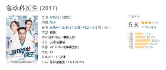 除了有利的外部环境,《急诊科医生》的主创配置也颇具爆款潜质。该剧的导演郑晓龙是有名的“爆款剧导演”,无论是早年间拍摄的《编辑部的故事》、《北京人在纽约》,还是近些年拍摄的《甄嬛传》和《芈月传》,都是不折不扣的爆款作品。主演方面,该剧没有一个“小鲜肉”,汇集了张嘉译、王珞丹、江珊等众多有实力的演员,演技方面也有所保障。
