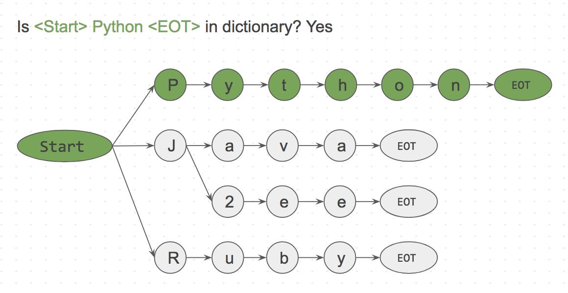 由于这是一个字符匹配过程,我们可以轻易地在进行到 l 的时候跳过整个 like ,因为 start 并没有和 l 相连。这使得跳过缺失单词的过程变得非常快。