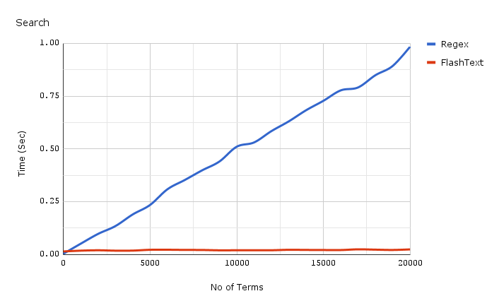 在介绍 FlashText 的结构和工作原理之前,先看看它的搜索性能表现: