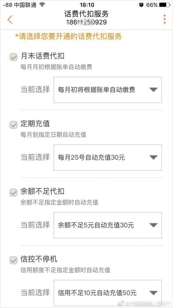中国联通APP上线”话费代扣“功能:四种服务不停机