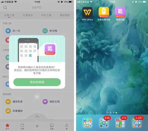 为了给用户提供更加便捷的使用体验,WPS iOS 8.0新增【桌面小工具】,【长图分享】、【电脑快传】、【拍照扫描】等功能,都可一键添加至桌面快捷方式。用户可根据自己对各功能的使用频率自定义添加,再也不用在工具栏中一一找寻了。